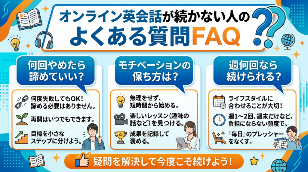 諦める必要はまったくありません。続かなかったのは「方法が合っていなかった」だけです。今まで試してきたサービスや学習方法とはまったく違うアプローチを試してみてください。たとえば、毎日25分のレッスンが続かなかったなら「週3回10分のスキマレッスン」に変える、フィリピン人講師が合わなかったならネイティブ講師を試す——方法を変えるだけで、劇的に継続しやすくなる場合があります。