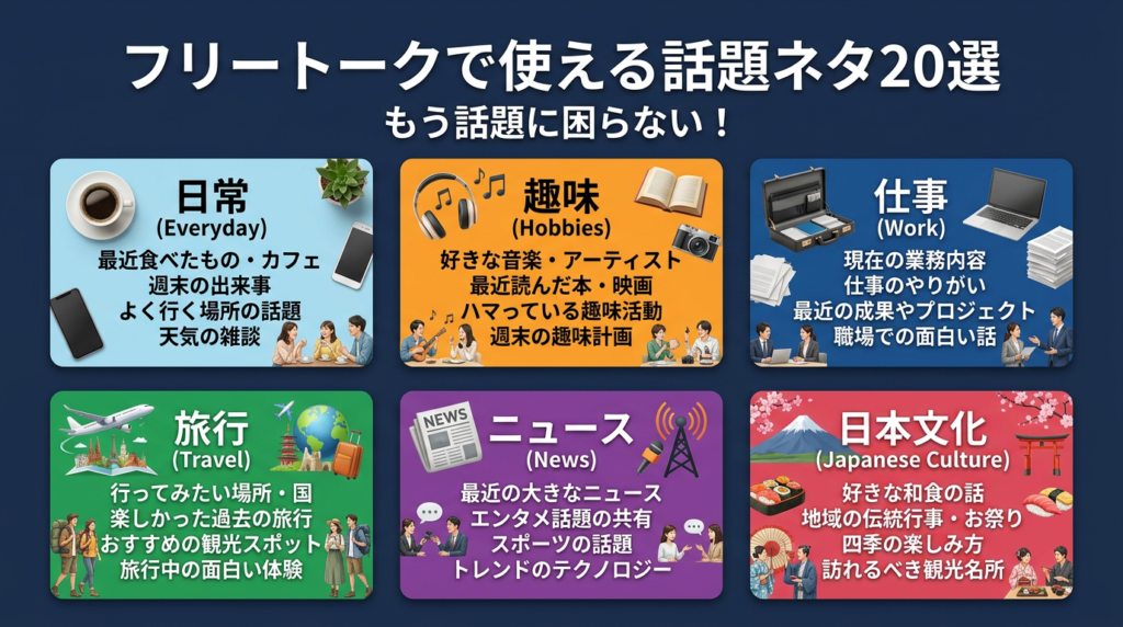 「何を話せばいいかわからない」はフリートーク最大の壁です。以下の20の話題をリスト化しておけば、もうネタ切れの心配はありません。レッスン前に今日使う話題を1〜2個選んでおくだけで、スムーズにフリートークが始められます。