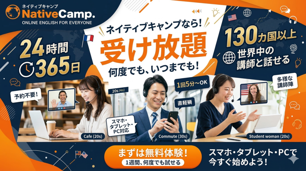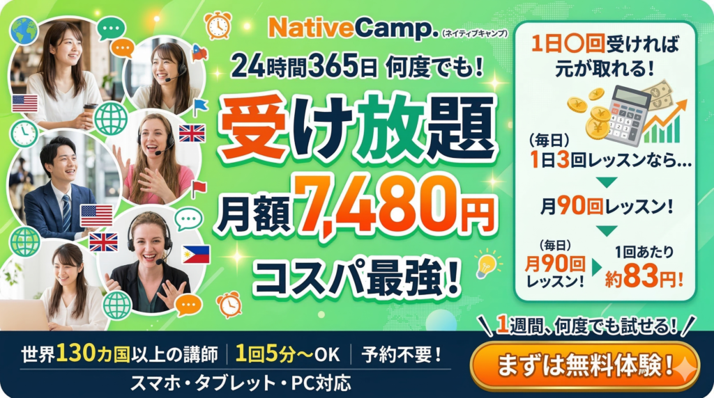 「予約不要・24時間・受け放題」というネイティブキャンプの強みは、忙しい社会人のスキマ時間学習と最高に相性が良いです。毎日コツコツ受ければ1レッスンあたり¥200台という圧倒的なコスパで、英語を話す量を最大化できます。日本人講師も追加料金なしで受講できるため、初心者でも安心して始められます。