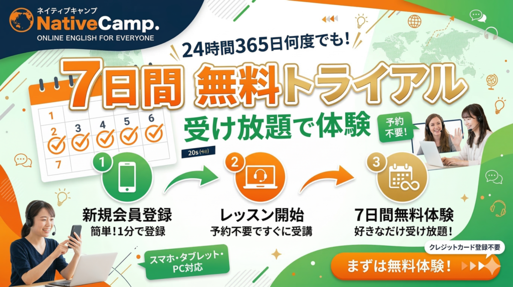 ネイティブキャンプでは7日間の無料トライアルが用意されており、期間中はプレミアムプランと同様に受け放題でレッスンを体験できます。クレジットカードの登録は必要ですが、7日以内に解約すれば費用はかかりません。