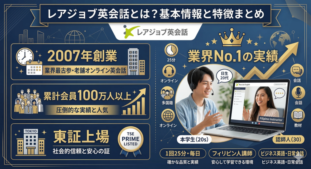 レアジョブ英会話は、株式会社レアジョブが運営する2007年創業・業界最古参クラスのオンライン英会話です。東証プライム上場企業が運営する信頼性の高さと、累計会員数100万人以上・累計レッスン回数5,000万回以上という圧倒的な実績を誇ります。