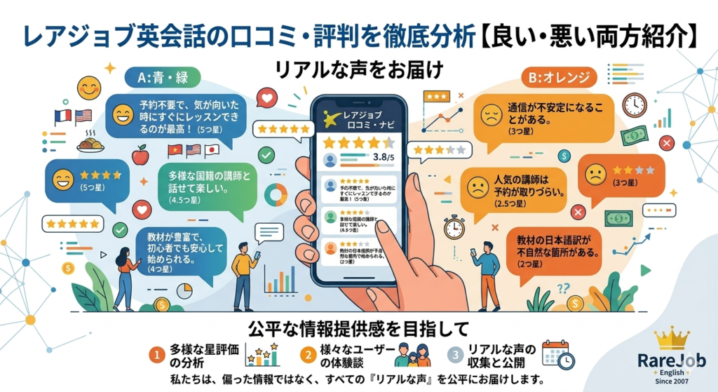 「レアジョブのビジネス英会話コースって、仕事で本当に使えるの?」「料金は安いけど、講師の質は大丈夫?」「DMM英会話とどっちが良い?」——レアジョブ英会話の受講を検討しているあなたは、こんな疑問を持っていませんか?