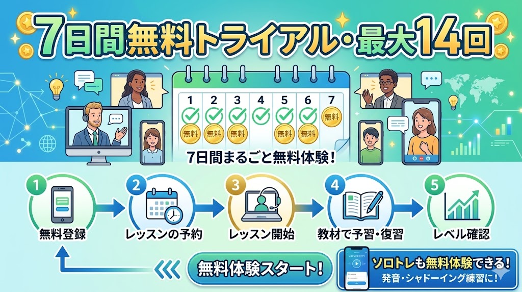レアジョブ英会話では7日間の無料トライアルが提供されており、選択プランの回数分のレッスンと日本人スタッフによる15分間のカウンセリングが無料で体験できます。レッスンの質・講師の雰囲気・ソロトレの使い勝手まで十分に体験できます。