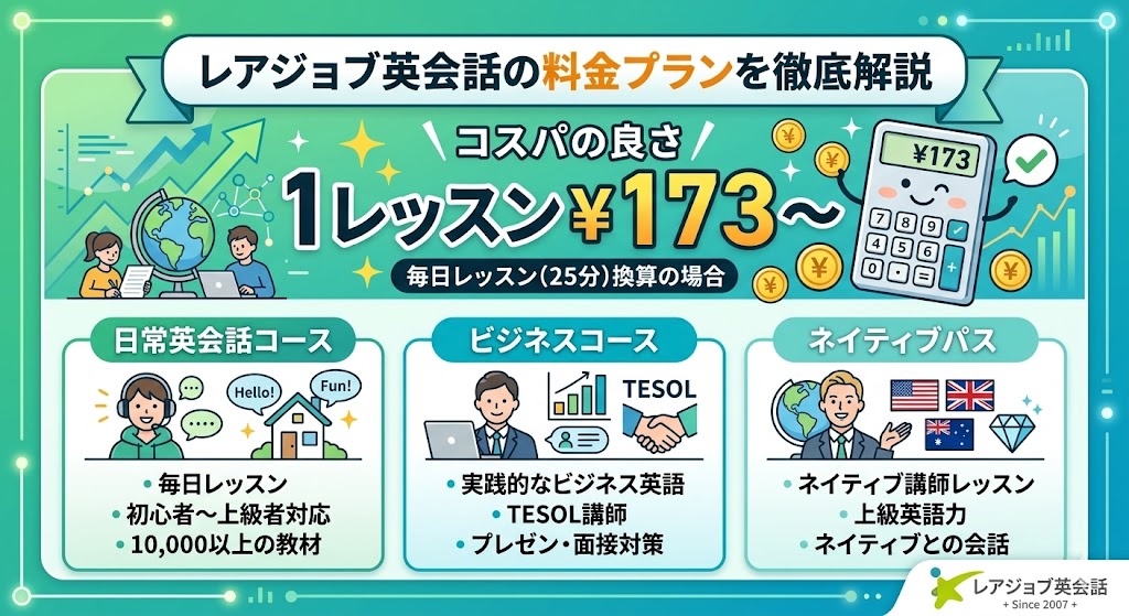 - コスパが高い——毎日100分プランで1レッスン¥173〜という業界最安水準